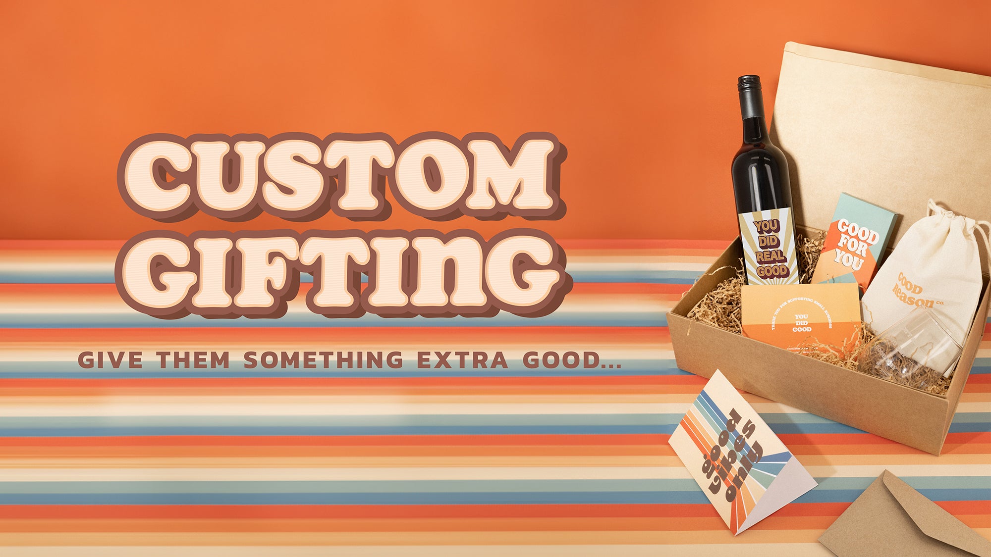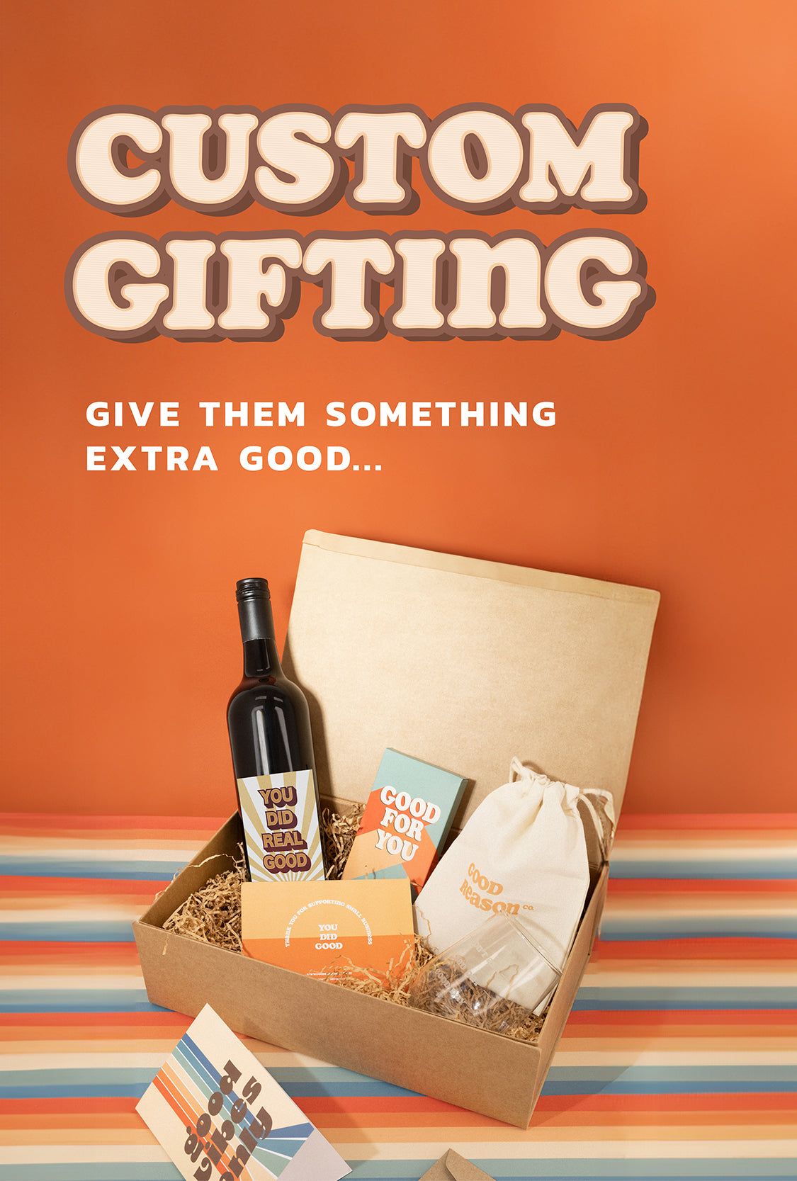 WHETHER YOU ARE CELEBRATING MILESTONES, FORGING NEW PARTNERSHIPS OR SIMPLY SPREADING GOOD VIBES, GOOD REASON CO WILL ELEVATE YOUR GIFT GAME WITH THOUGHTFUL CUSTOM CREATIVELY BRANDED GOODIES THAT LEAVE A BIG IMPRESSION AND MAKE PEOPLE FEEL REALLY DAMN GOOD.